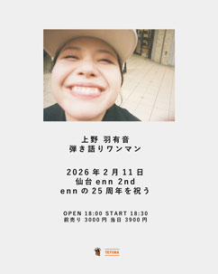 | ennの25周年を祝う 上野 羽有音(TETORA) 弾き語りワンマン 2026年2月11日(水祝) 会場:LIVE HOUSE enn 2nd 仙台市青葉区中央2-7-11 アルトスクエア B1F Red 開場 18:00 / 開演 18:30 前売\3000(D代別) ※e+ ※先行チケット1/10(土) 12:00〜1/18(日) 23:59 ※未就学児童入場不可/小学生以上チケット必要 ※整理番号付 ※開場の15分前より、整理番号順に整列を開始致します 主催:THE NINTH APOLLO 問:NORTH ROAD MUSIC TEL 022-256-1000(平日11:00〜16:00※祝祭日除く) |