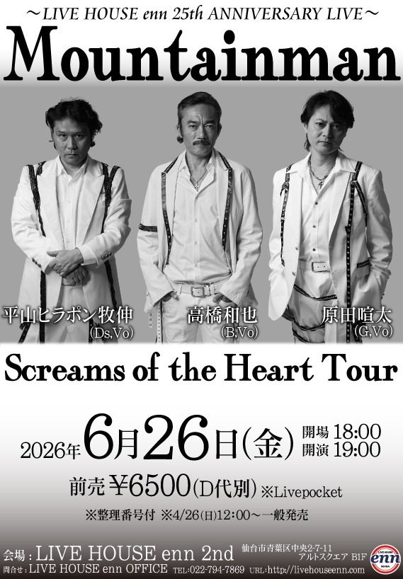 | 〜LIVE HOUSE enn 25th ANNIVERSARY LIVE〜Mountainman Screams of the Heart Tourr Mountainman :高橋和也(B,Vo) :原田喧太(G,Vo) :平山ヒラポン牧伸(Ds,Vo) 2026年6月26日(金) 会場:LIVE HOUSE enn 2nd 仙台市青葉区中央2-7-11 アルトスクエア B1F Red 開場 18:00 / 開演 19:00 前売\6500(drink代\600別) ・先行優先販売 1)高橋和也ファンクラブMICOTO優先販売 https://fan.pia.jp/kazuya.fc.micoto/ 2)原田喧太オンラインサロン会員優先販売 https://kentasroom.memberpay.jp/ 販売期間:4月12日(日)12:00〜4月19日(日)23:59 ・一般チケット販売(先着)(Livepocket) ※4/26(日)12:00〜発売開始 ※Livepocketの一般販売ページは公開準備が整い次第、公式HP他でご連絡いたします。 ※整理番号付 ※開場の15分前より、整理番号順に整列を開始致します 問合せ:LIVE HOUSE enn OFFICE 電話 022-794-7869 メール info@livehouseenn.com |
