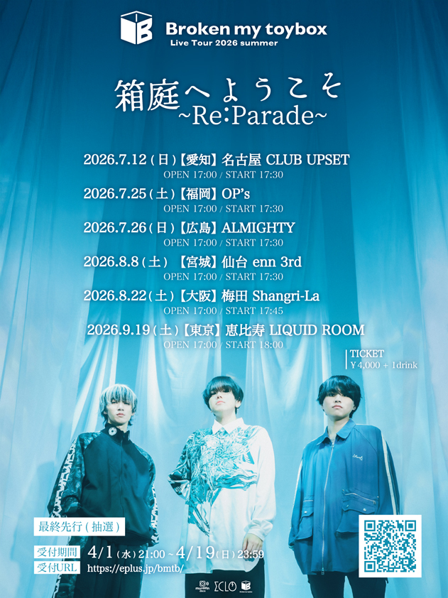 | Broken my toybox [Live Tour 2026 summer] 箱庭へようこそ〜Re:Parade〜 Broken my toybox 2026年8月8日(土) 会場:LIVE HOUSE enn 3rd 仙台市青葉区中央2-7-11 アルトスクエア B1F Blue 開場 17:00 / 開演 17:30 前売\4000(D代別) イープラス最終先行受付中!! ※e+ ※4/1(水)20:00〜4/19(日)23:59 ※5/2(土)〜一般発売 ※未就学児入場不可 ※整理番号付 ※開場の15分前より、整理番号順に整列を開始致します |