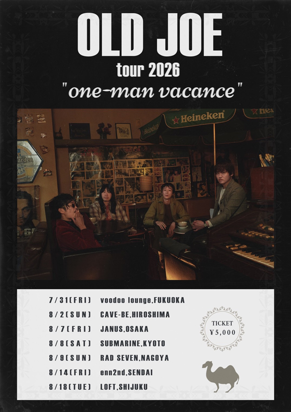 | OLD JOE tour 2026 "one-man vacance" OLD JOE 2026年8月14日(金) 会場:LIVE HOUSE enn 2nd 仙台市青葉区中央2-7-11 アルトスクエア B1F Red 開場 18:00 / 開演 19:00 前売\5000(D代別) ※Livepocket ※4/16(木)12:00〜発売開始 ※整理番号付 ※開場の15分前より、整理番号順に整列を開始致します 問合せ:LIVE HOUSE enn OFFICE 電話 022-794-7869 メール info@livehouseenn.com |