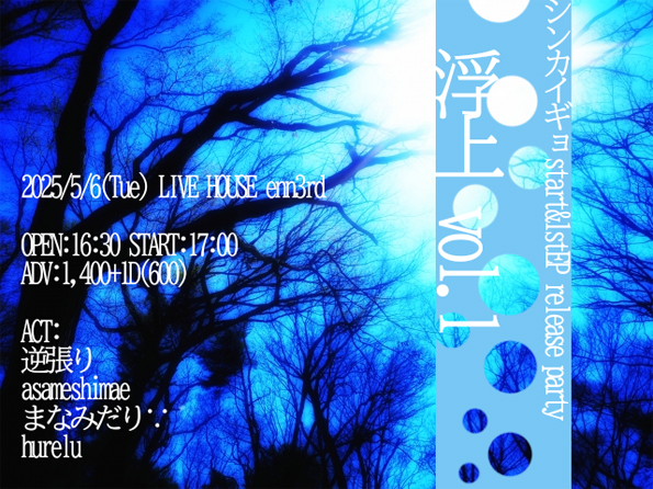 夜:【シンカイギョ start and release party 「浮上 vol.1」】![]() ※画像をクリックで拡大されます シンカイギョ asameshimae 逆張り まなみだり∵ hurelu 16:30/17:00 前売\1400(D別) |