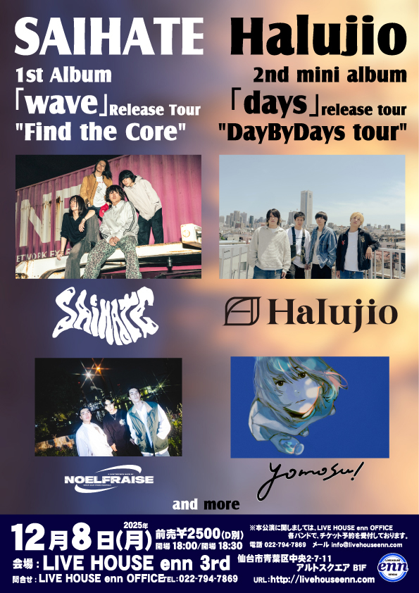 【SAIHATE 1st Album「wave」 Release Tour 「Find the Core」 Halujio 2nd mini album「days」release tour “DayByDays tour”】 ![]() ※画像をクリックで拡大されます SAIHATE Halujio NOEL FRAISE ヨモスガラ 他 18:00/18:30 前売\2500(D別) ※各バンド予約、LIVE HOUSE enn 予約 問合せ:LIVE HOUSE enn OFFICE 022-794-7869 http://livehouseenn.com |