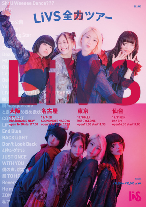 夜:【LiVS全力ツアー】![]() ※画像をクリックで拡大されます LiVS 16:30/17:00 【チケット料金】 ・超最高チケット(先着):\31500(D別) ※最優先入場、全員集合チェキ、終演後デコチェキ会、感謝の手紙、10秒動画、サイン&コメントチェキ券 ・最高チケット(先着):\10000(D別) ※優先入場、全員集合チェキ券、サイン&コメントチェキ券 ・人間チケット3000円(D別) ・新規チケット0円(D別) ※TicketDive ・入場順:超最高チケット→最高チケット→人間チケット→新規チケット→当日券 |